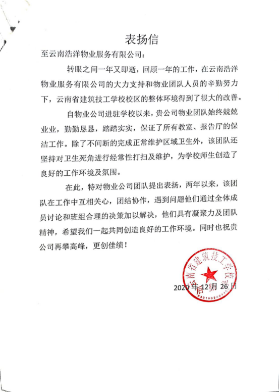 近日,云南浩洋物業(yè)“云南省建筑技工學(xué)?!蔽飿I(yè)服務(wù)中心,收到了一封來(lái)自于甲方業(yè)主的表?yè)P(yáng)信。信中表示,在云南浩洋物業(yè)服務(wù)團(tuán)隊(duì)兢兢業(yè)業(yè)、勤勤懇懇、踏踏實(shí)實(shí)的努力下,云南省建筑技工學(xué)校的校區(qū)整體環(huán)境得到了很大的改善,為學(xué)校師生創(chuàng)造了良好的工作環(huán)境及氛圍。