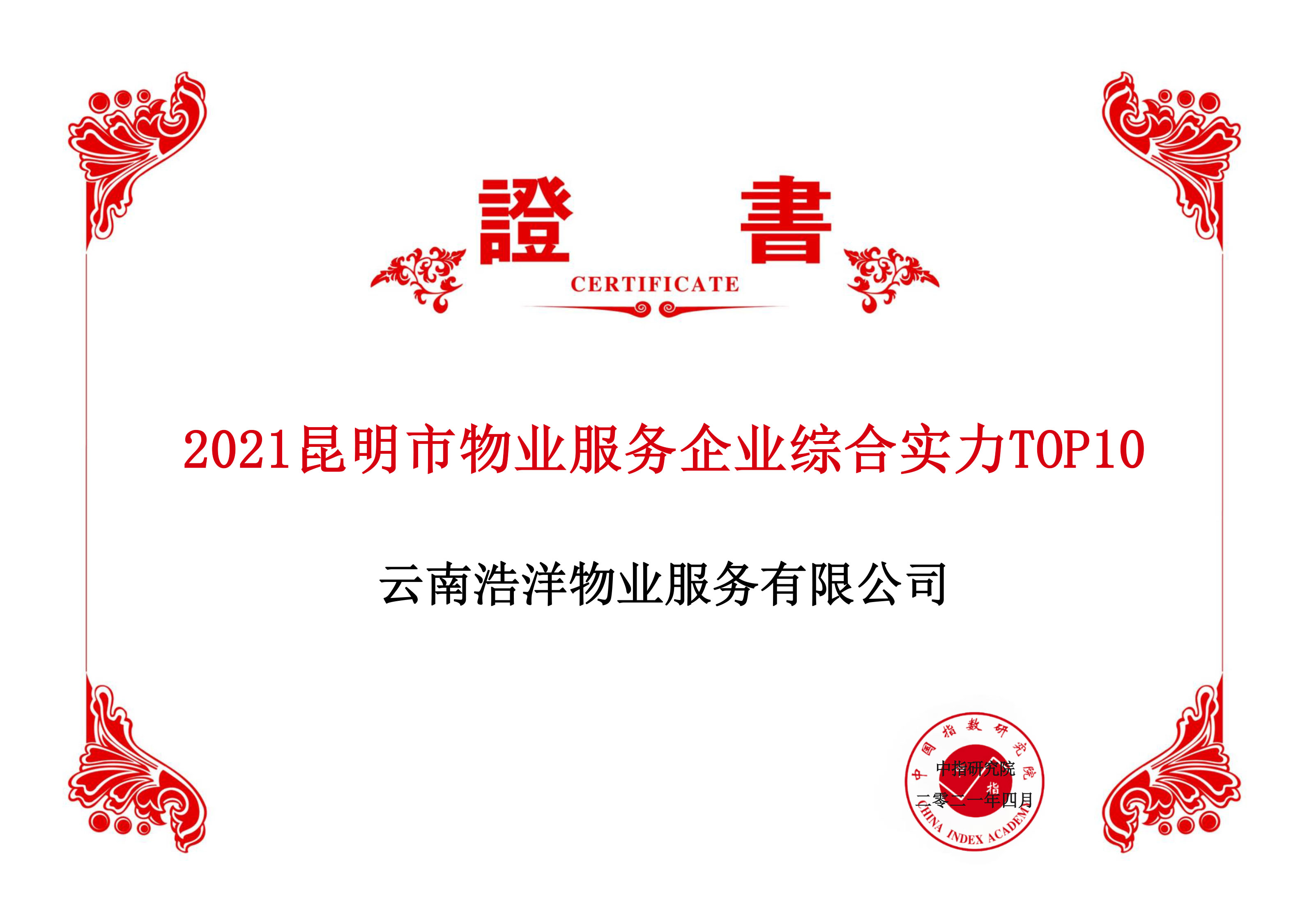 云南浩洋物業(yè)服務有限公司榮獲“2021昆明市物業(yè)服務企業(yè)綜合實力TOP 10”