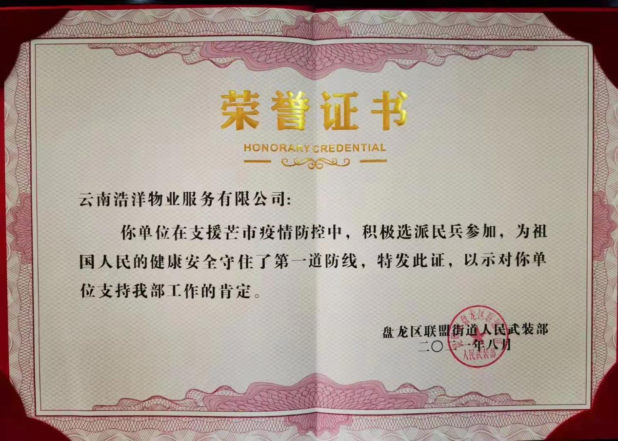 近日,我公司被盤龍區(qū)聯(lián)盟街道人民武裝部頒發(fā)榮譽證書,證書中表示“我公司在支援芒市疫情防控工作中,積極選派民兵參加,為祖國人民的健康安全守住了第一道防線”。