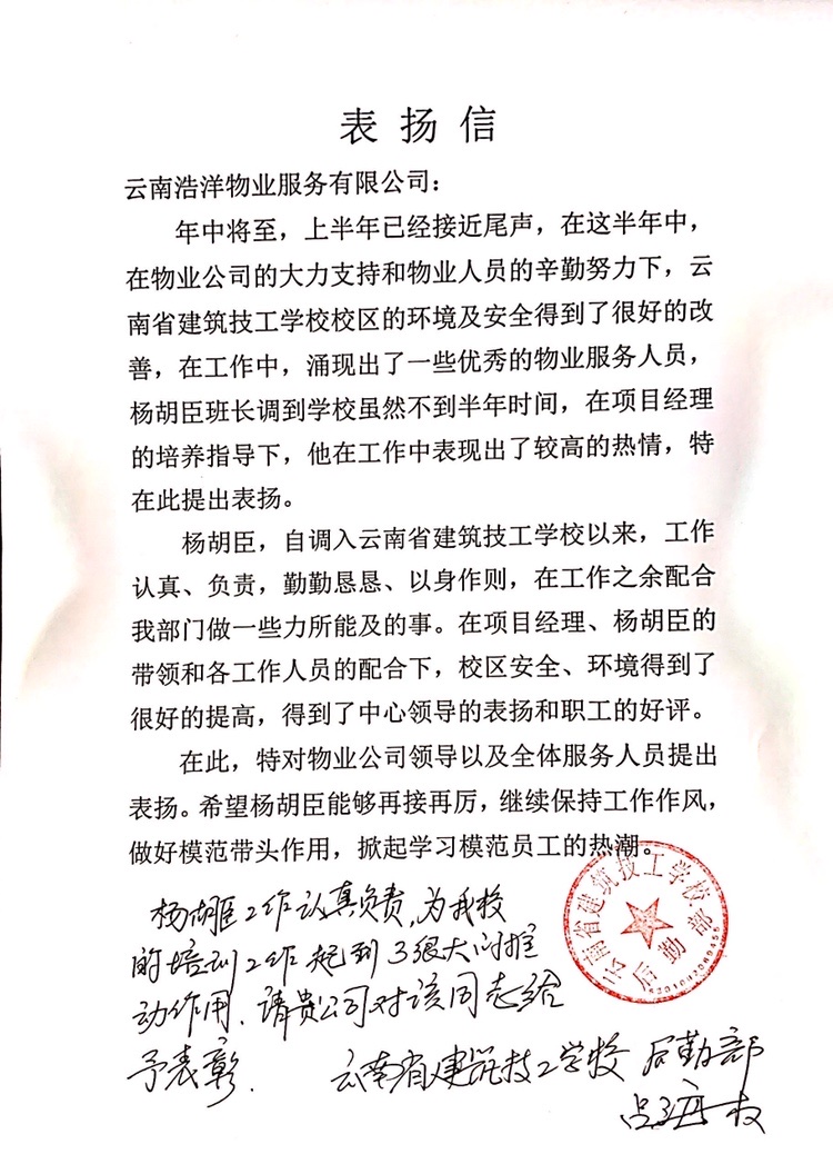近日,“云南省建筑技工學(xué)?!焙笄诓繛槲夜締T工楊胡臣和項(xiàng)目全體工作人員送來了表揚(yáng)信。信中表示,我公司員工楊胡臣在工作中表現(xiàn)出較高熱情,工作認(rèn)真負(fù)責(zé)、勤勤懇懇,為學(xué)校的培訓(xùn)工作起到了很大的推動(dòng)工作。整個(gè)校區(qū)在“浩洋人”的努力下,校區(qū)安全、環(huán)境得到了很好地提高。